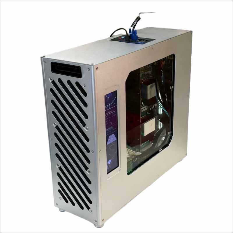 浸没式液冷电竞机采用了创新的浸没式液冷散热技术,将电脑主板、CPU、GPU 等元器件完全浸入绝缘冷却液中,利用液体高热导率快速散热,确保电脑主机低温静音运行,延长使用寿命。通过透明视窗可以直观的看到内部硬件布局,而且核心部件如内存、电源线和主板被 RGB 灯光环绕,营造科技感 。 电竞机显示屏幕能实时显示 CPU 、GPU使用率和温度等关键参数。